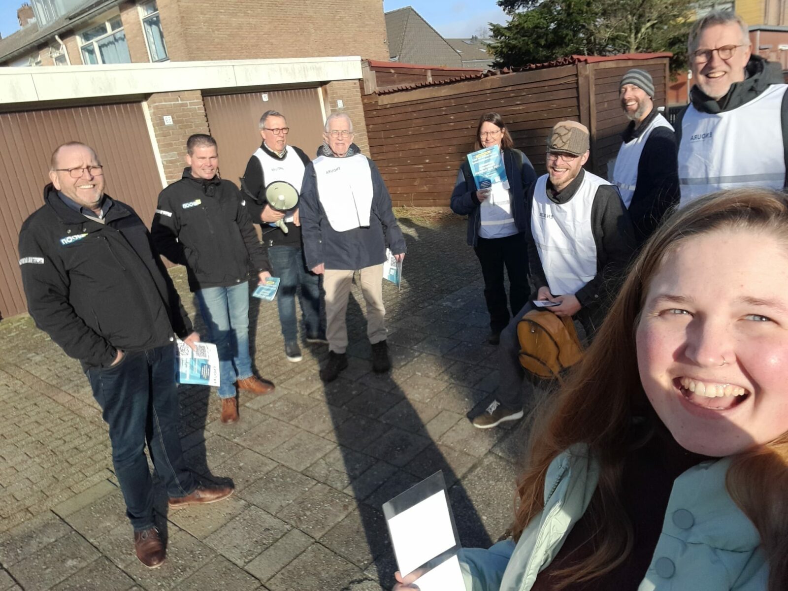 Foto: opbouwwerker op pad in de wijk met vrijwilligers en de Uwoon om inwoners te helpen verduurzamen in huis.