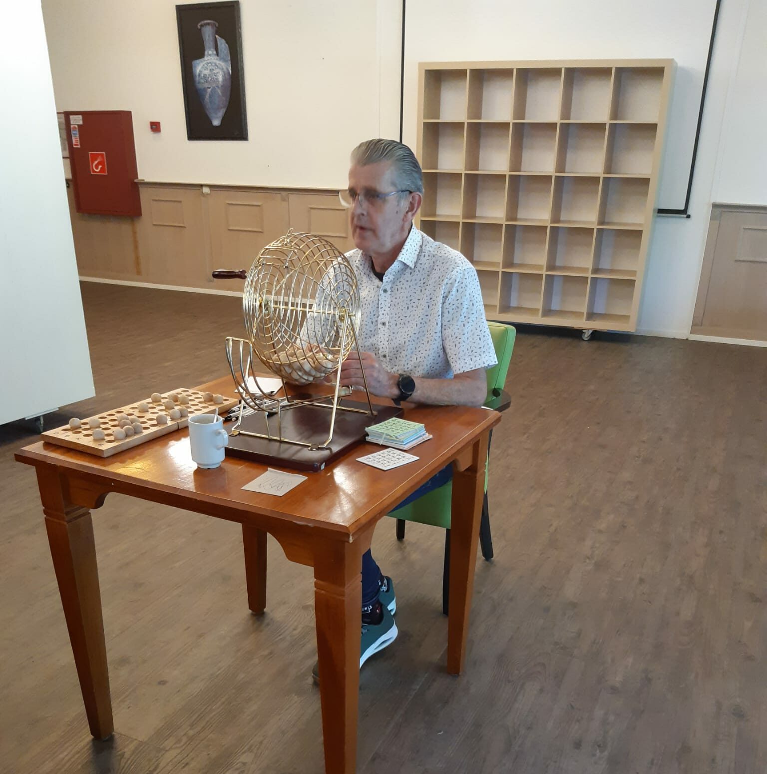 Foto: vrijwilliger tijdens de bingo-avond in Wijkontmoetingscentrum De Aanleg.