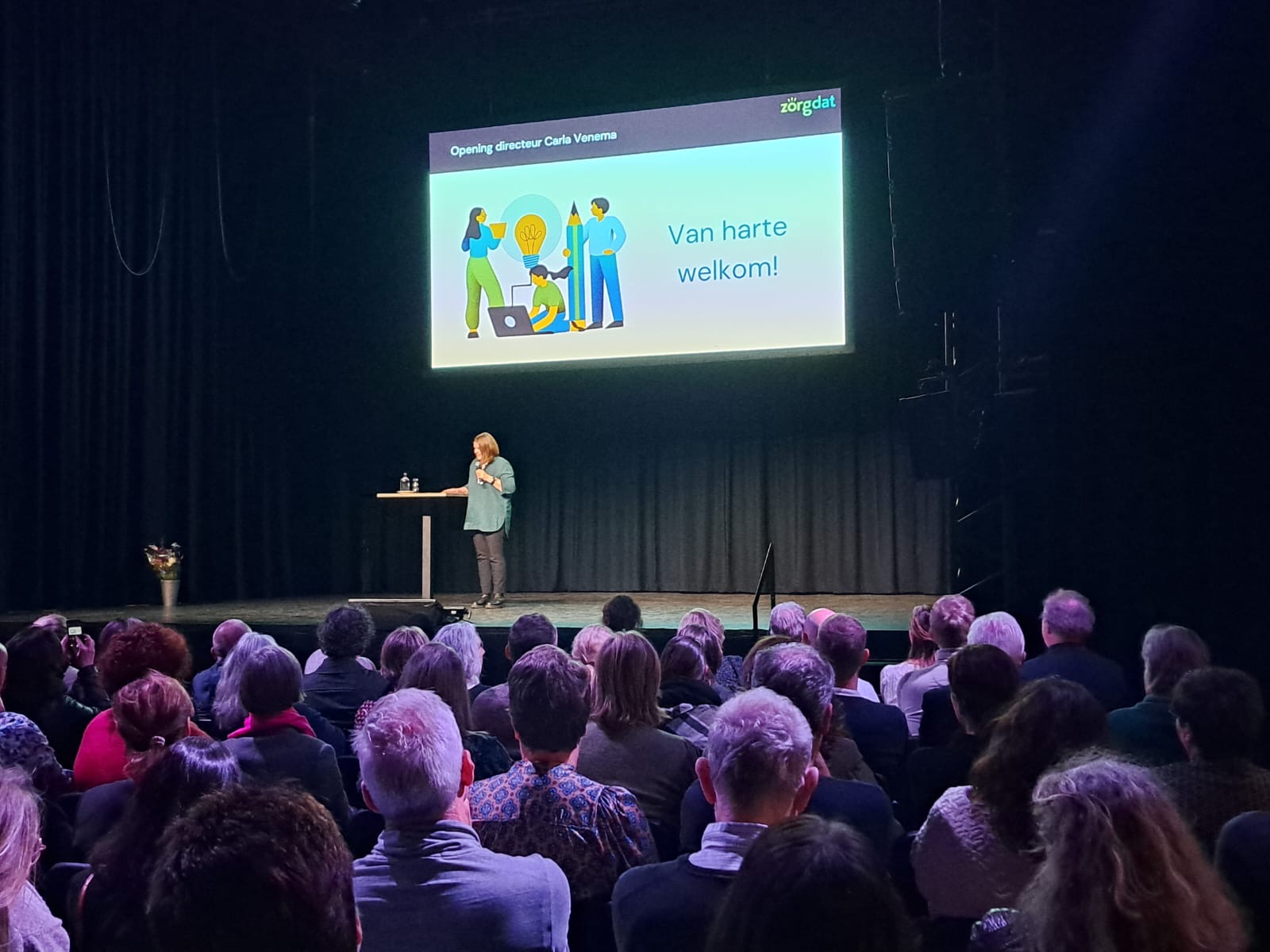 Foto: Directeur Carla Venema op het podium om de Netwerkbijeenkomst te openen.