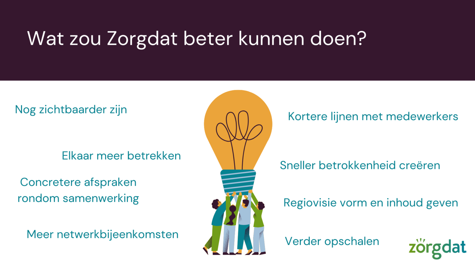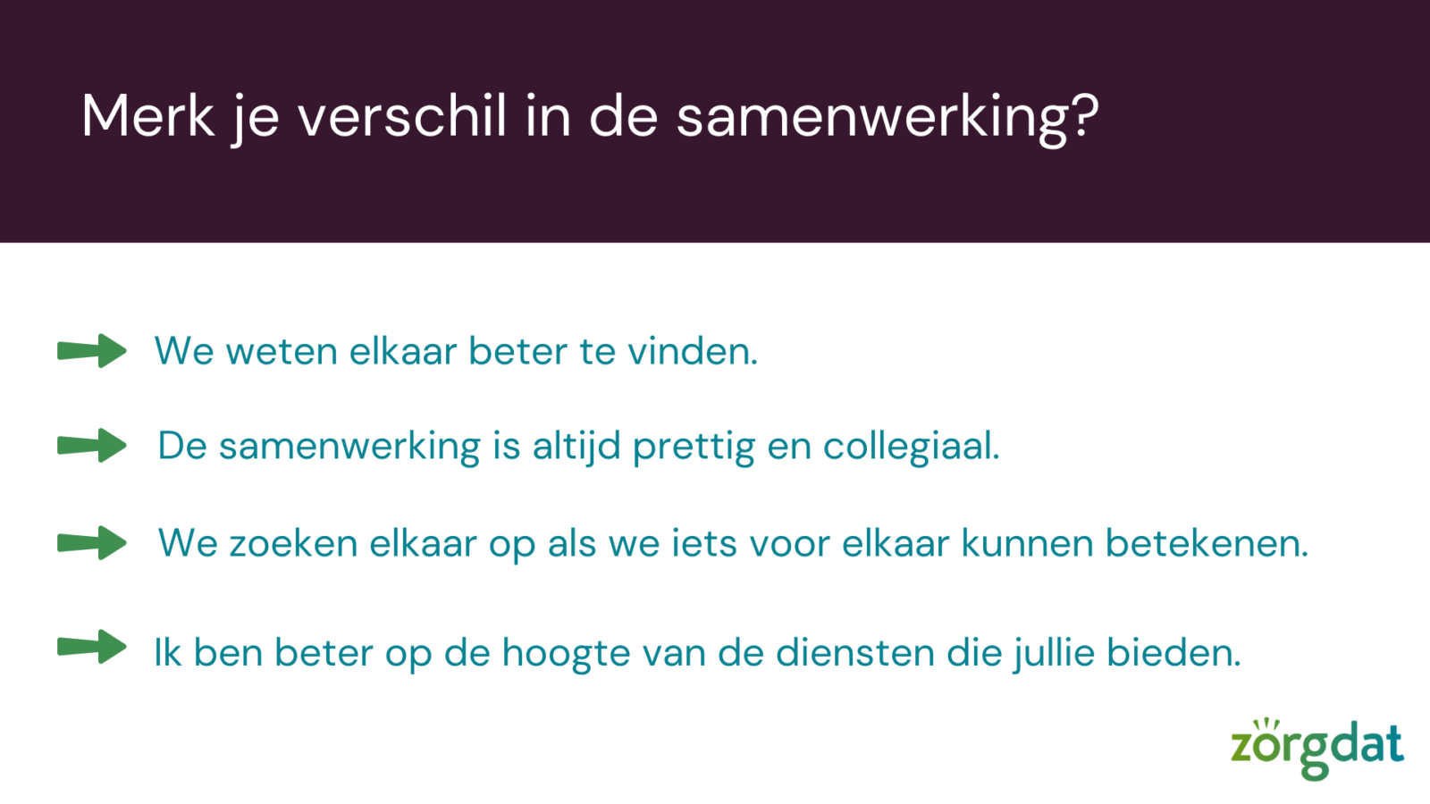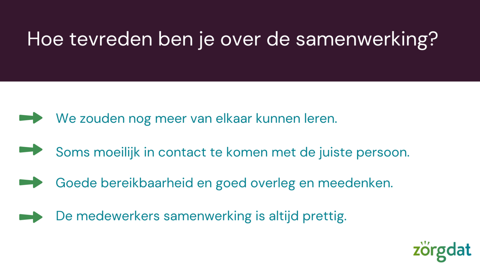 Voorafgaande aan de netwerkbijeenkomst is door genodigden een enquête ingevuld over de samenwerking met Zorgdat.