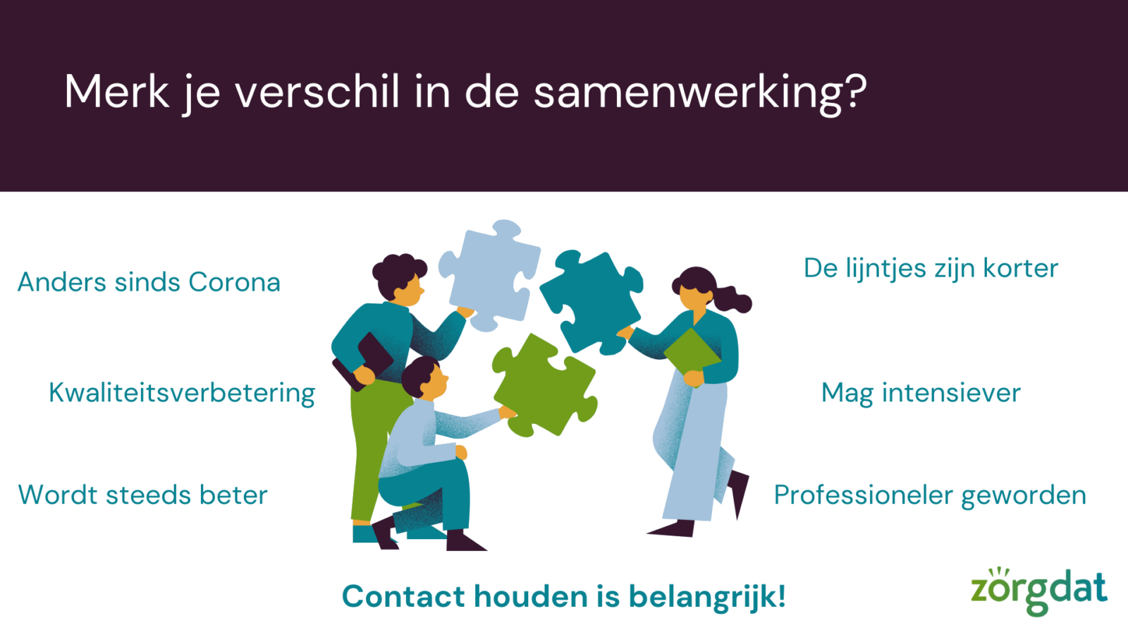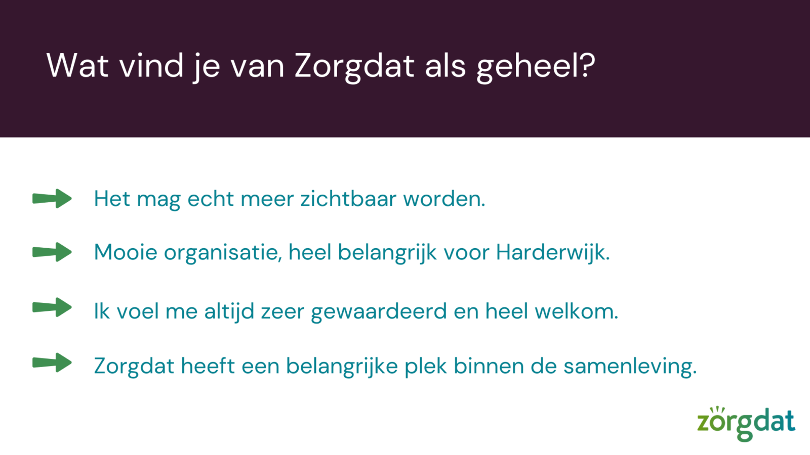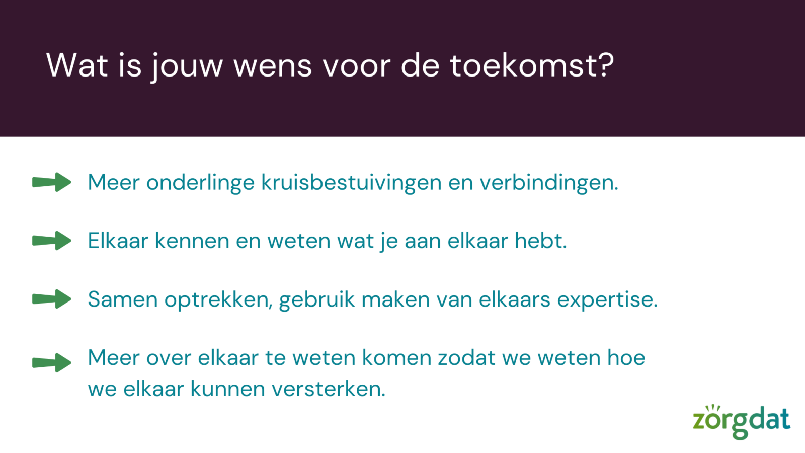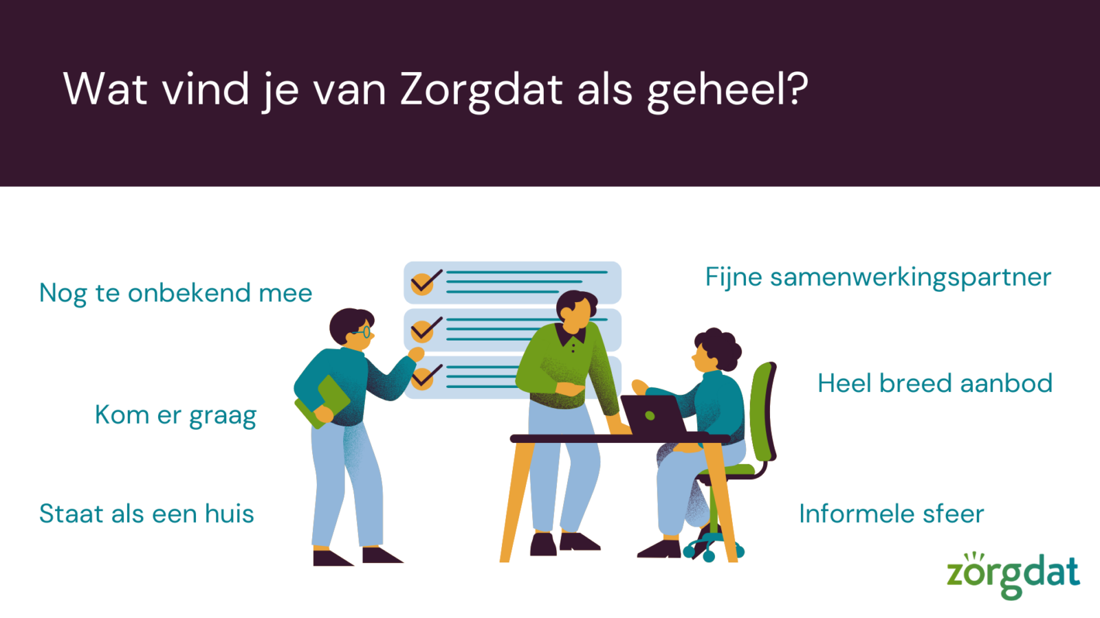 Voorafgaande aan de netwerkbijeenkomst is door genodigden een enquête ingevuld over de samenwerking met Zorgdat.